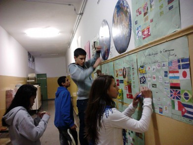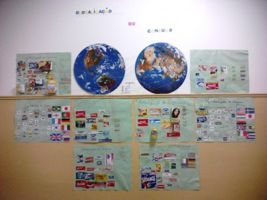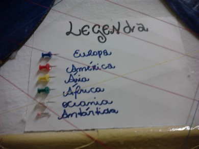 Os cartazes dos alunos podem ser dispostos em volta de um mapa Mundi fixado em uma placa de isopor. Os alunos fixam tachinhas coloridas (cada cor representa um continente) e os liga por uma linha no respectivo país no mapa mundi. Não esquecer de construir uma legenda:
